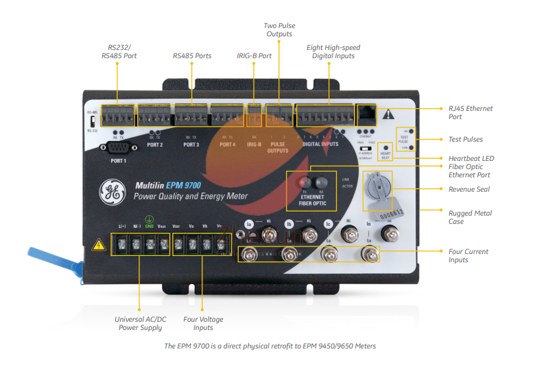 Meter EPM 9700 dilengkapi dengan kemampuan komunikasi yang luas yang memungkinkannya berkomunikasi dengan berbagai sistem SCADA atau sistem komunikasi lainnya secara bersamaan. Meter ini memiliki 6 port komunikasi sebagai standar. Port-port ini mencakup 4 port serial dan 2 port komunikasi berbasis Ethernet. Port Ethernet mencakup port serat optik dengan terminal ST dan port RJ45. Kedua port menggunakan alamat IP terpisah, sehingga dapat beroperasi pada jaringan redundan secara simultan.